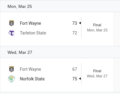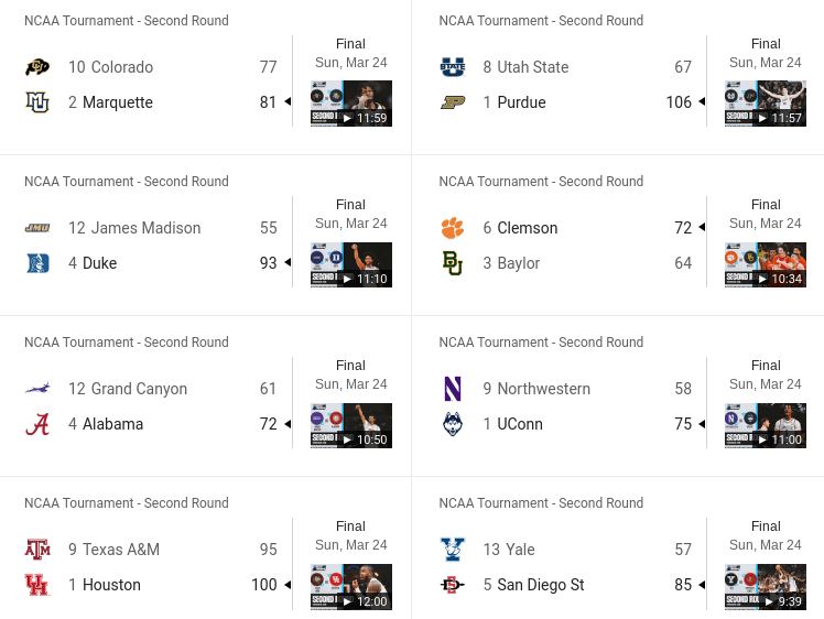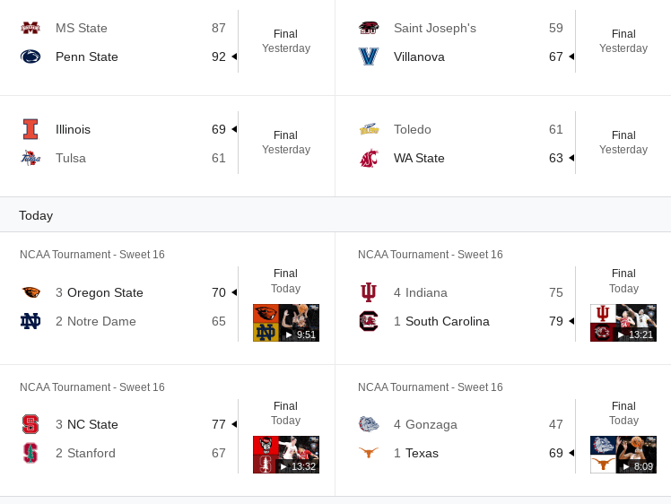 54-51 Duke Blue Devils and 69-47 Texas Longhorns